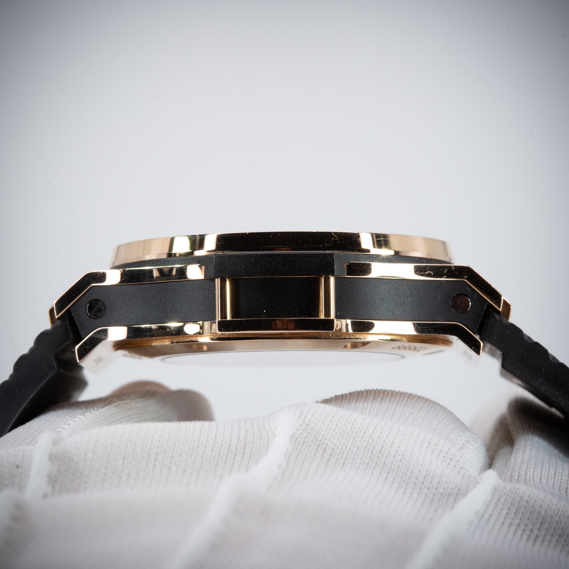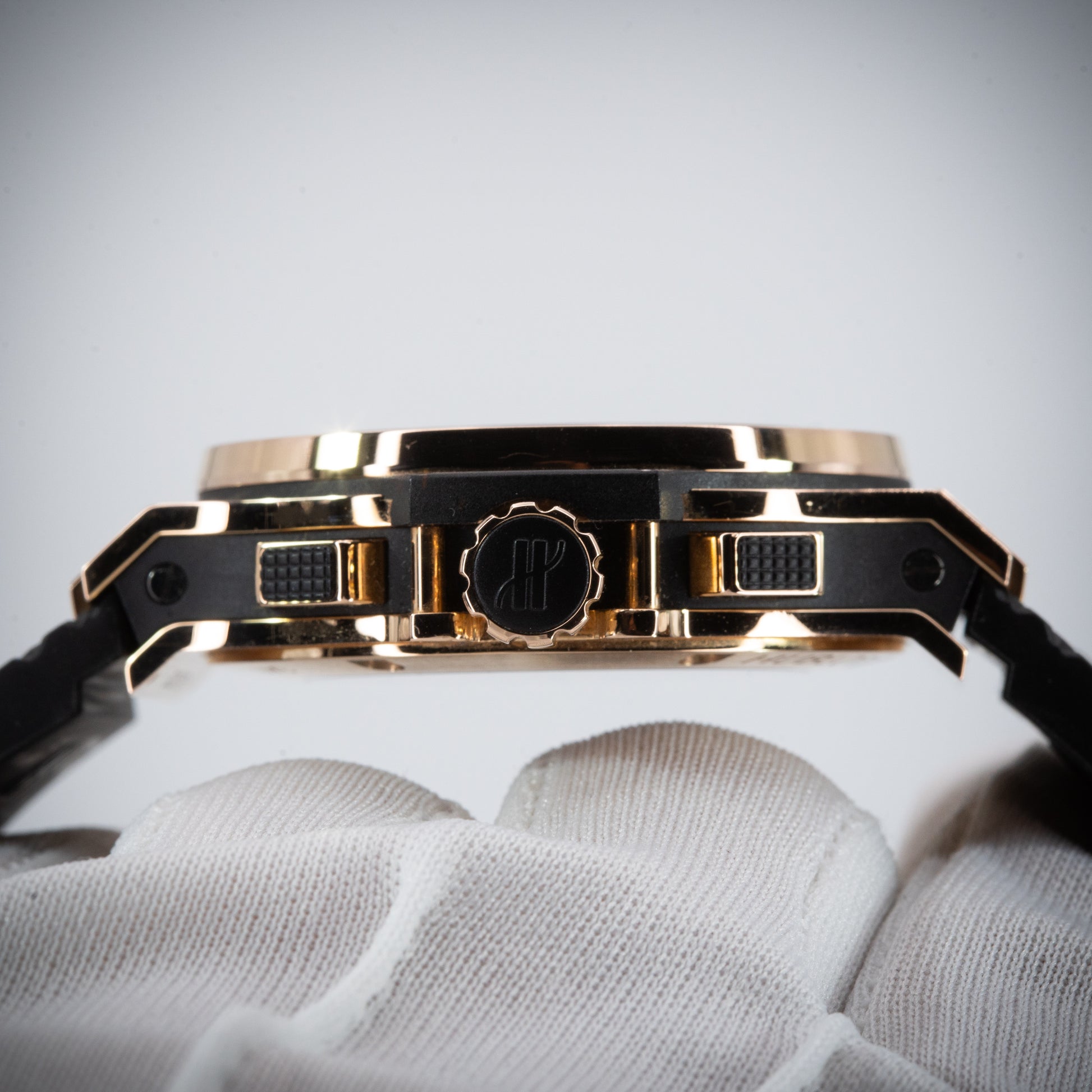This Big Bang 341.PX.130.RX is in excellent collector-grade condition. The 18K rose gold case shows a rich warm tone with only light surface marks from gentle use, while the black rubber strap retains its supple feel and sharp edges. All functions operate flawlessly, and the chronograph resets precisely to zero. Complete full set with box and papers — a beautiful and versatile rose gold Big Bang for any collection.