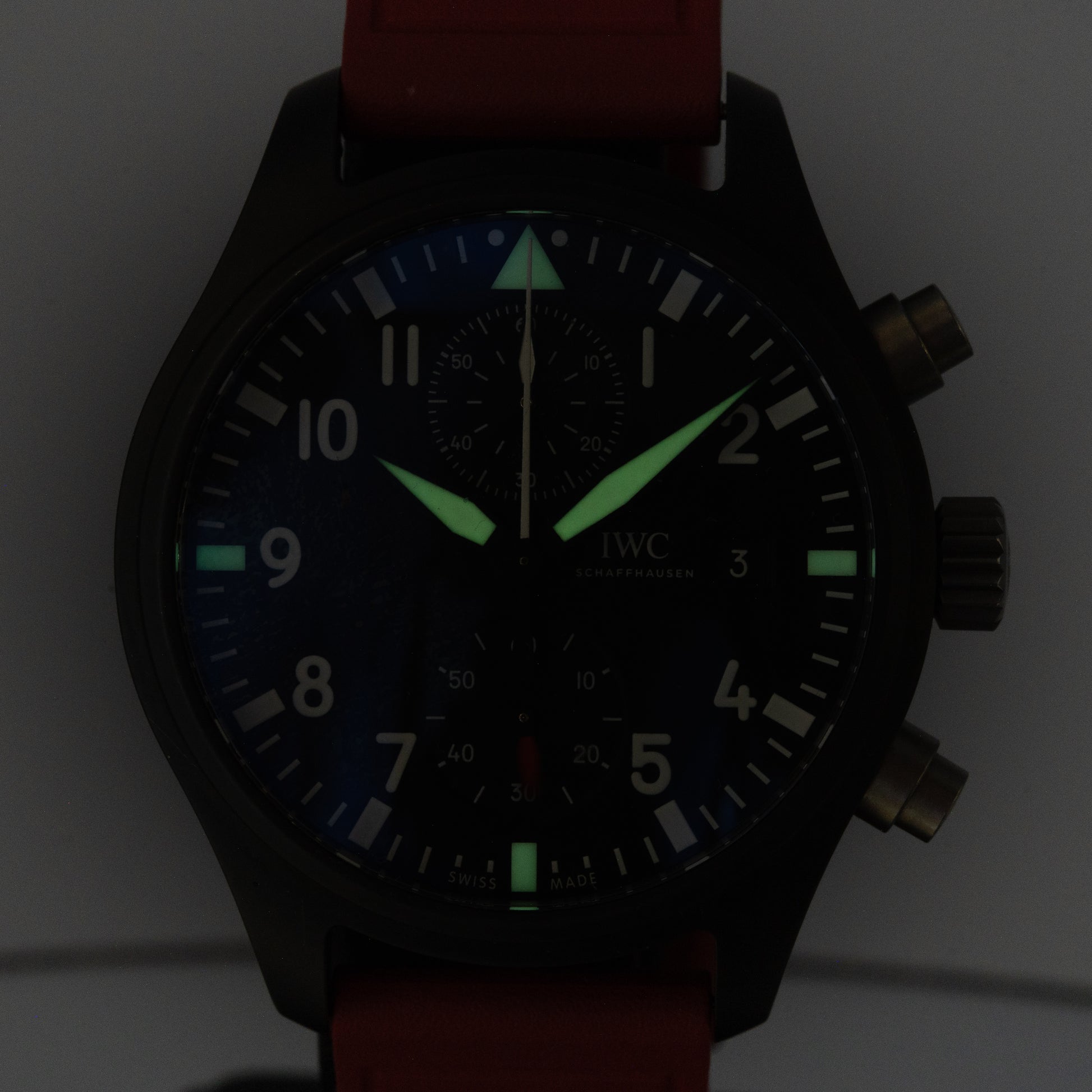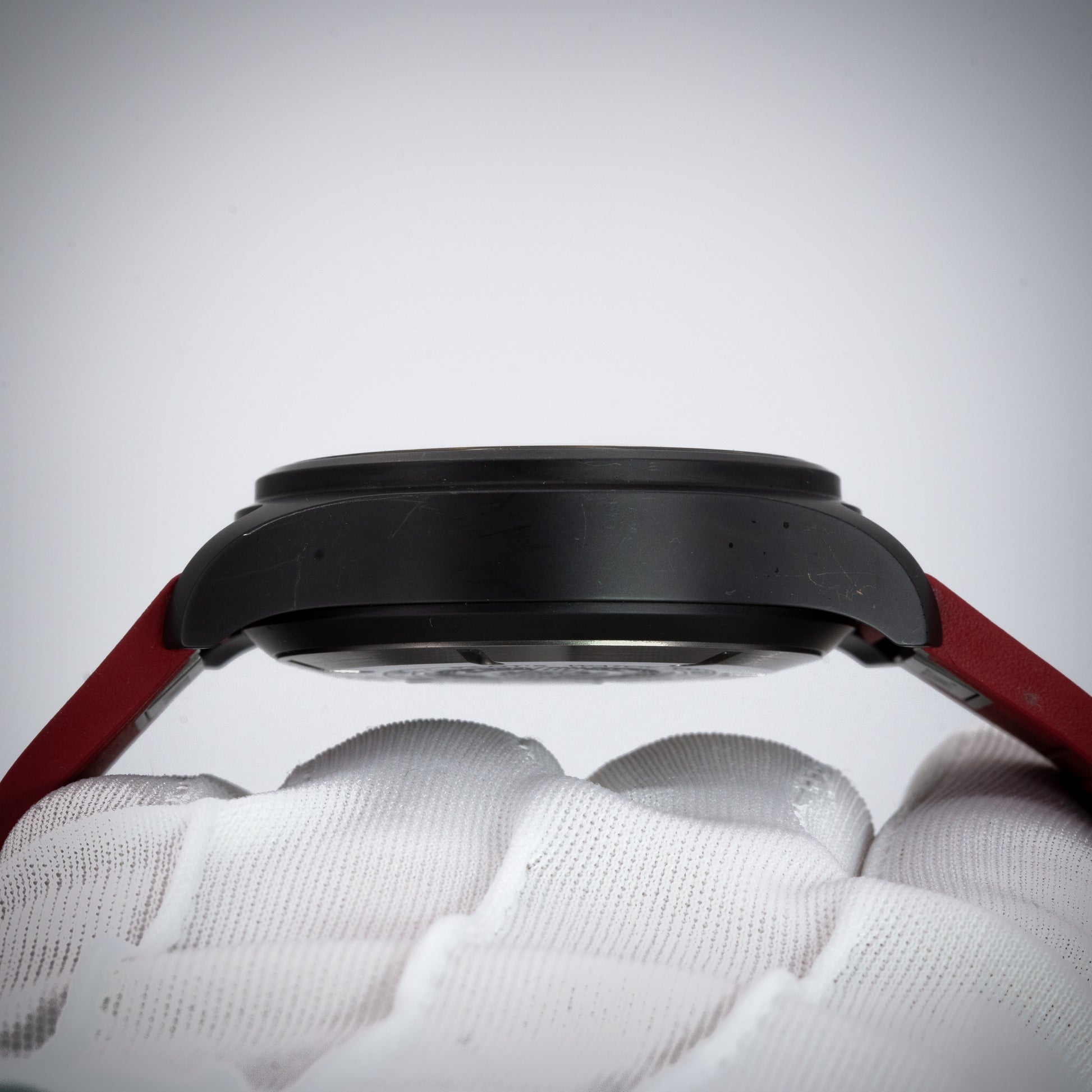 This IW389001 has been lightly worn and meticulously maintained. The ceramic case retains its deep black sheen with minimal surface wear, while the OEM red rubber strap with IWC’s quick-change system adds a bold and sporty contrast. A complete full set in excellent condition, a standout piece within the Top Gun collection.